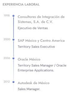 Con más de 30 años de experiencia en ventas consultivas en procesos de negocio y tecnología para clientes en la IP en diferentes industrias y Gobierno. Trayectoria laboral en empresas internacionales: SAP, Oracle y Autodesk. Licenciado en Administración de Empresas, egresado de la Universidad La Salle. Diplomado en Negocios avalado por CONLA.